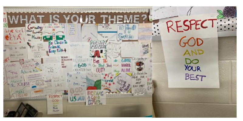 In one of our 78er classrooms, student work is plastered all over one of the walls. As you can tell from the heading, “What Is Your Theme?,” students were asked to write six words. The one pictured separately stood out to me, because it pretty well sums it up. If we get the respect God part correct and do our best to do that each day, all other parts of life will be encased in the correct perspective.