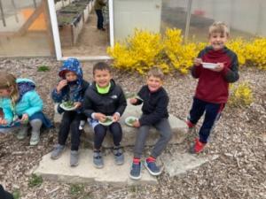 First Graders had a chance to visit the goats and think about how different animals care for their young, like the goats and how that is different than how a frog cares for their young. We also spent a couple sessions exploring sound outside, using sticks for drumming and scraping sounds and using cups to make shakers out of a variety of materials.